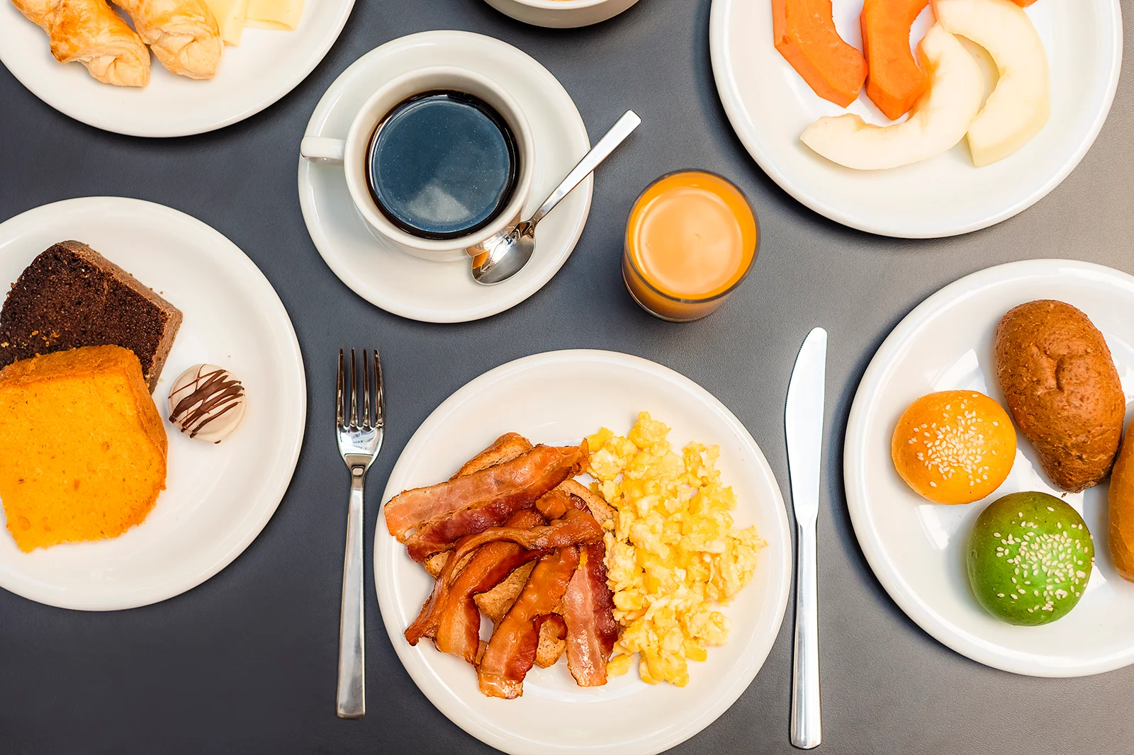 Delicie-se com pão de queijo, bacon, ovos mexidos, salada de fruta